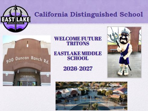 Eastlake Middle School Course Selection – If your child is scheduled to attend Eastlake Middle School next year (students living in the 91914 or 91915 zip code), your student had an orientation with the ELM administration team on, Friday, February 6th, 2026. Students were able to meet their new counselors and learn about campus life for next year!